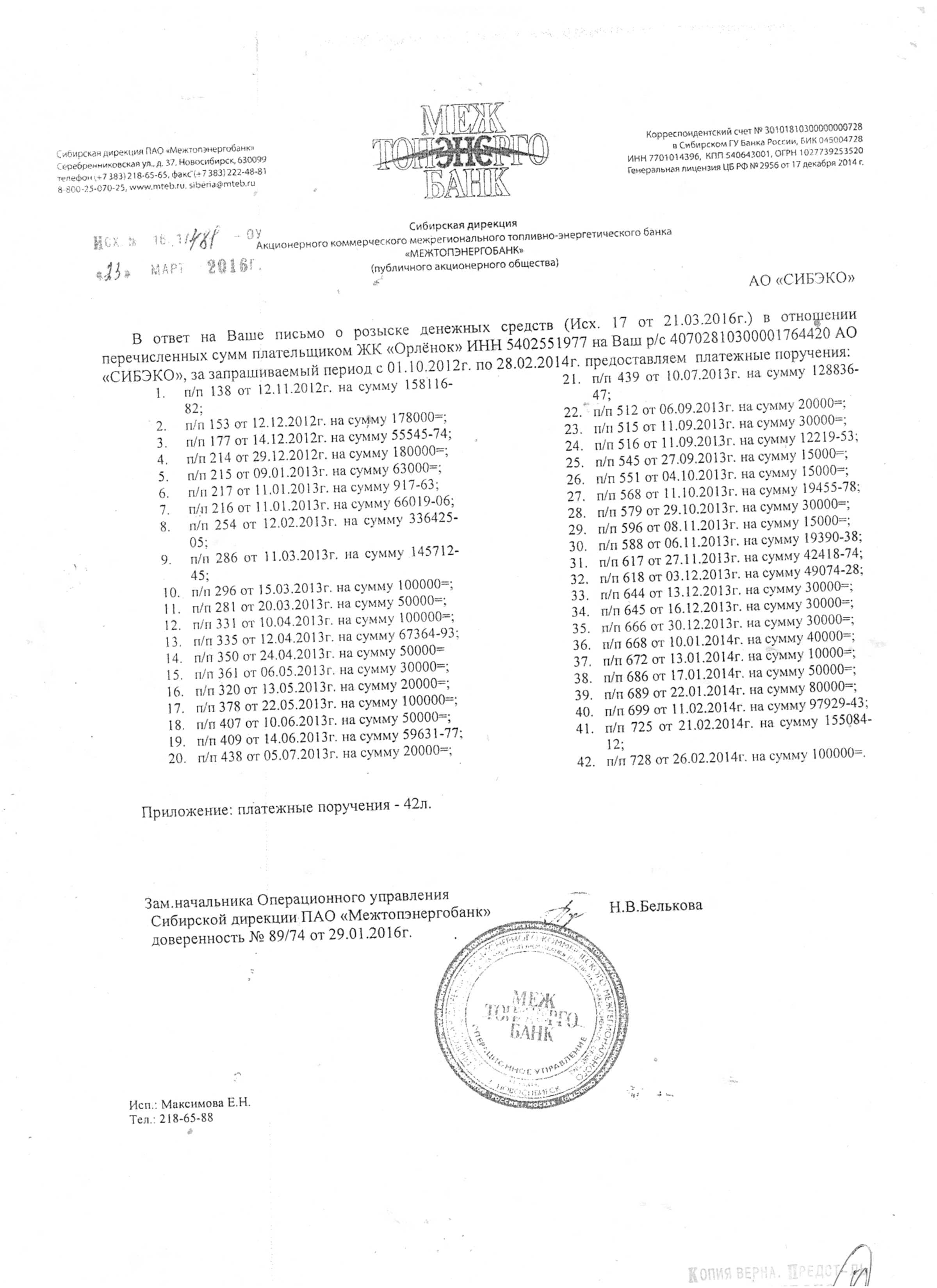 - Отзыв на исковое СИБЭКО (1).doc (doc, 29КБ), постановление 7 арбитражного аппеляционного суда.pdf (pdf, 224КБ), ЕГРЮЛ ЖК Орленок на 01 06 2017.pdf (pdf, 94КБ), Договор с ЖК лист1.jpg (jpg, 556КБ), Договор с ЖК лист2.jpg (jpg, 653КБ), договор с ЖК лист 9.jpg (jpg, 572КБ), Договор с ЖК лист10.jpg (jpg, 379КБ), Платежи в СИБЭКО 1.jpg (jpg, 379КБ), Платежи в СИБЭКО 2.jpg (jpg, 311КБ)
